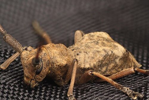 Canon EOS Kiss X5+Tamron SP AF90+テレプラスMC4 DGX ストロボ:絞り優先モードF11、露光1/200固定、ストロボ+2、ケンコー影とり、ISO-AUTO 天気が悪く虫を探せないので、飼育中のイワワキセダカコブヤハズカミキリを深度合成した。F11、フラッシュ、16枚…
